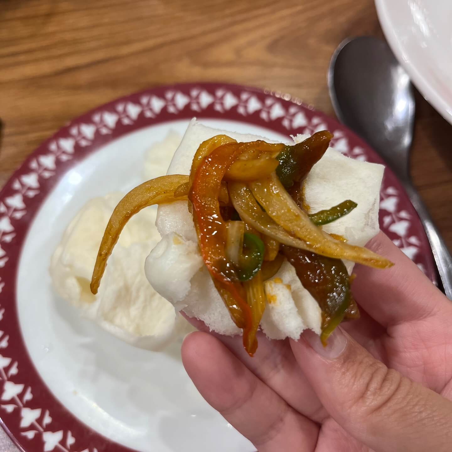 하얀 꽃빵이 따뜻하게 나오고 소고기 고추 잡채가 나옵니다. 따뜻한 꽃빵을 살짝 뜯어서 고추 잡채를 올려 먹어주면 환상입니다. 야채의 아삭한 식감과 불향이 느껴졌던 소스가 잘 어우러져 맛있게 먹었습니다.